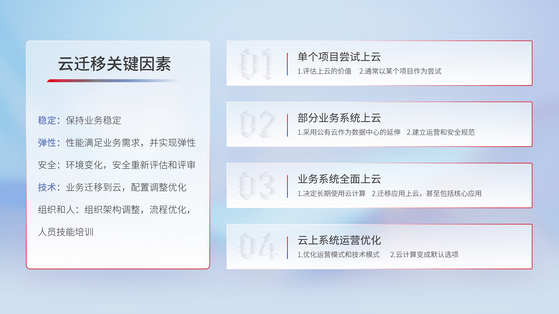 结合实际业务,,从规划设计、、、、云平台选型、、、云原生改造、、、数据迁移、、、集成交付,,迁移全过程为客户识别最佳上云路径,,,,做好风险识别管理,,,,设计网络架构、、、身份权限、、、安全审计合规、、、、操作审计、、日志审计、、、、监控告警策略、、多站点容灾设计等,,,,对云上基础设施进行整体规划,,提升IT治理水平,,,以满足弹性、、、高可用、、、、高性能的需求。。。。