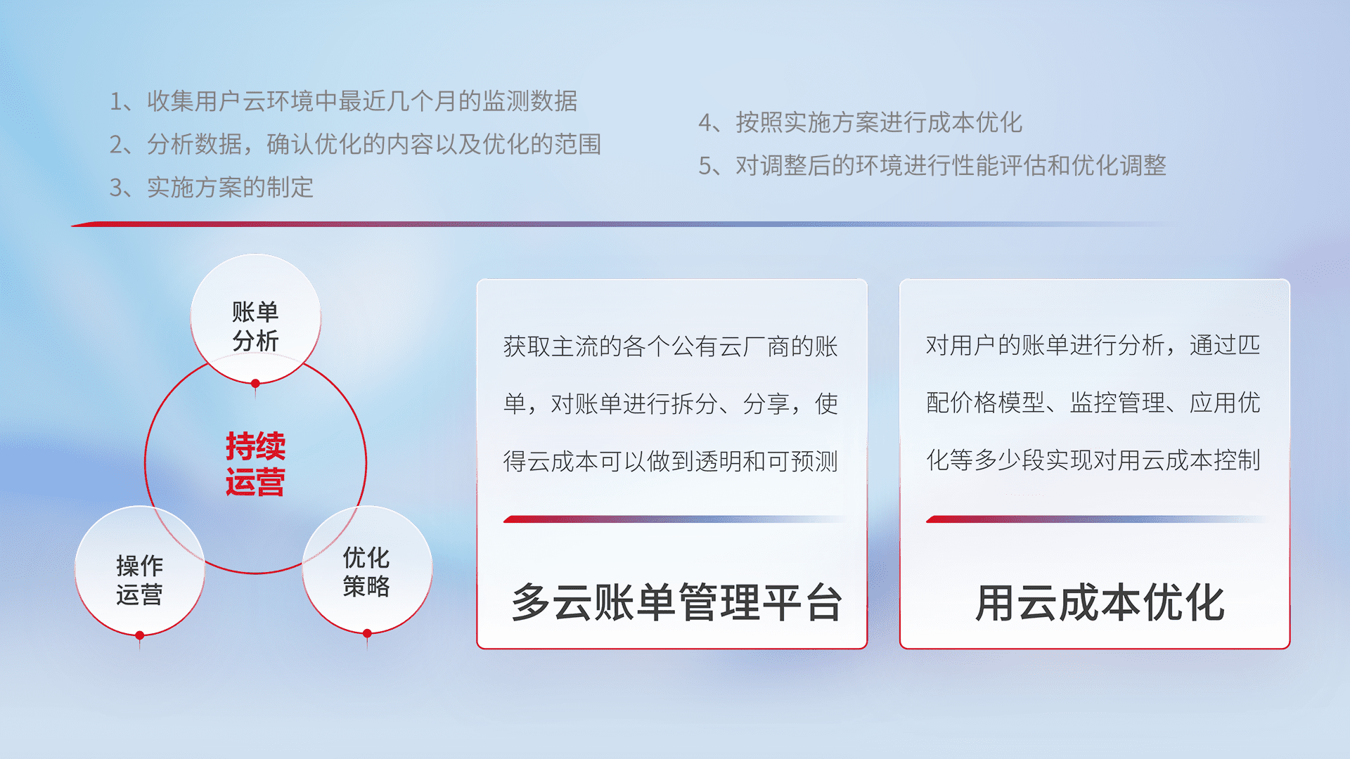 通过多云纳管,,以统一的资源数据模型把客户的云资源进行抽象和封装,,,进而实现对多云资源的统一操作,,,保障云资源管理的可靠性、、稳定性与可用性。。。量身定制化运维内容,,,配置、、、开发运维、、补丁管理、、、备份、、监控、、、认证和访问管理、、、审计和日常巡检等,,保障在用云过程中的可靠度,,,,稳定度以及高可用率。。。。